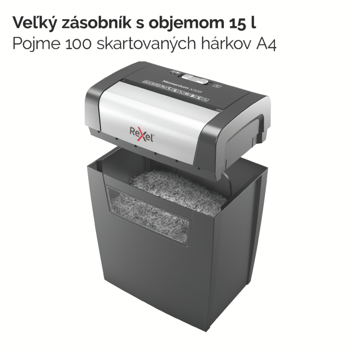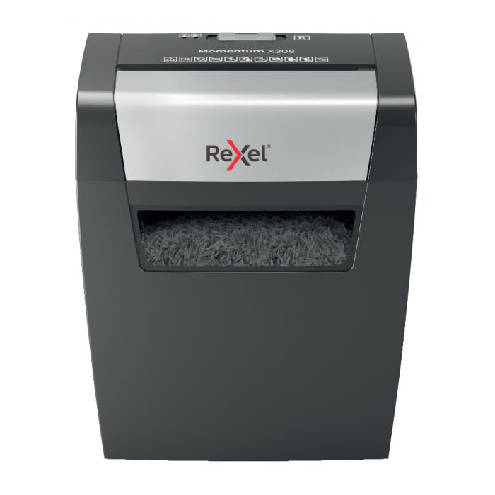 Nezastaviteľná skartovačka! Rexel Momentum X308 skartuje až 8 hárkov naraz a vydrží v nepretržitom chode 3 minúty, vhodná na použitie doma. Krížový rez na úrovni zabezpečenia P3 reže papier na časti s veľkosťou 5 × 42 mm. Odpadový kôš s kapacitou 15 l pojme 100 hárkov A4.