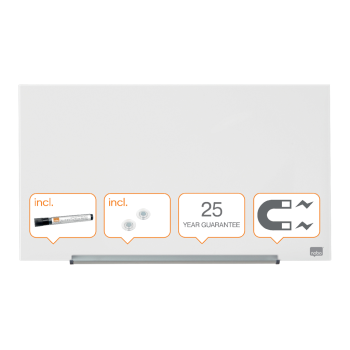 Na širokouhlé sklenené tabule Nobo sa vojdú všetky vaše nápady! Širokouhlý formát a minimalistický rámček maximalizujú využiteľnú plochu na písanie. So systémom InvisaMount™ bude inštalácia na stenu bezproblémová a navyše všetky montážne prvky sú úhľadne schované za doskou tabule. Takže tabule majú moderný a štýlový dizajn. Tabuľa je dodávaná s vysokokvalitným odnímateľným odkladačom na popisovače. Magnetický sklenený povrch zaručuje najlepšiu možnú mazateľnosť a je vhodný na každodenné používanie. Veľkosť uhlopriečky: 31” (79 cm).