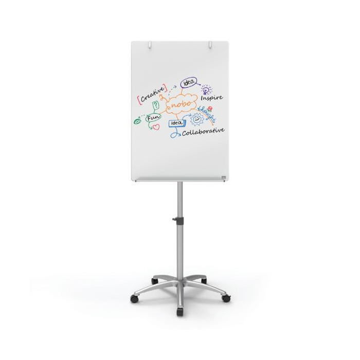Na sklenený flipchart Nobo sa vojdú všetky vaše nápady! Štýlový moderný dizajn a výškovo nastaviteľná základňa na kolieskach sa hodí do každej zasadacej miestnosti a kancelárie. Obsahuje háčiky na zavesenie flipchart blokov. Magnetický sklenený povrch zaručuje najlepšiu možnú mazateľnosť a je vhodný na každodenné používanie. Rozmery 70 x 100 cm.