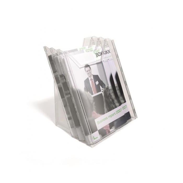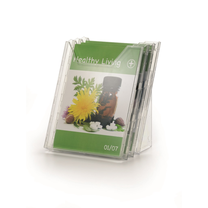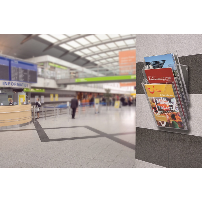 Kombinovaný stojan s tromi odkladačmi na prospekty a časopisy formátu A4 s tromi odkladačmi a závesným dielom na stenu, resp. stôl. Materiál priehľadný plast. Hrúbka 24 mm. Vnútorné rozmery 240 × 311 mm. Rozmery š x v x h: 240x311 mm
