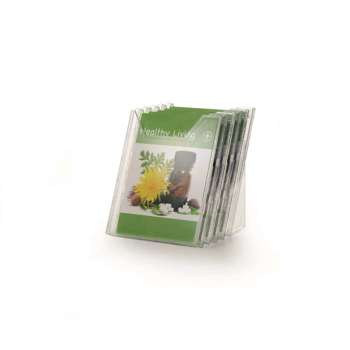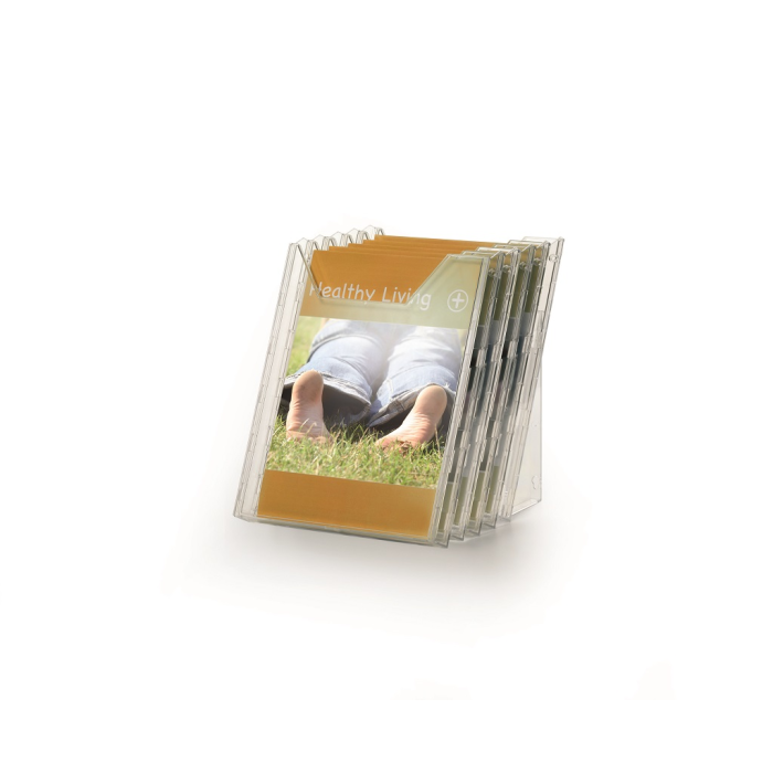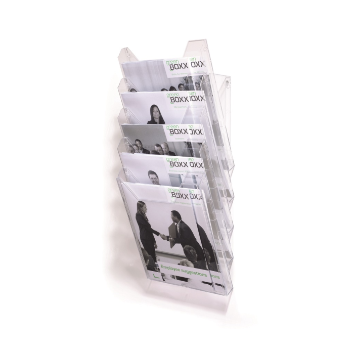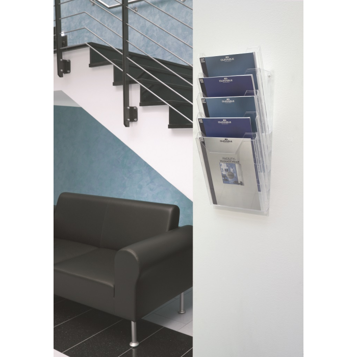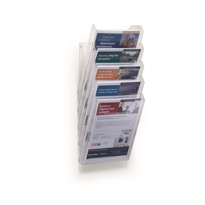 Stojan na prospekty a časopisy formátu A4 s piatimi odkladačmi a závesným dielom na stenu, resp. stôl. Materiál priehľadný plast. Hrúbka 24 mm. Vnútorné rozmery max. 240 × 311 mm.
