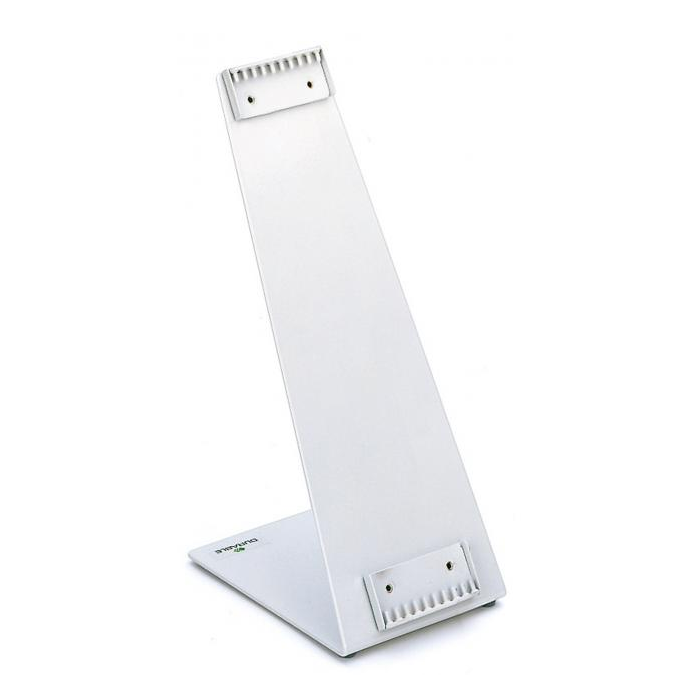 Extrémne pevný odľahčený kovový stojan v tvare L. Plastový poťah odolný voči oderu. Dodávaný prázdny s kapacitou na 10 panelov. Farba sivá.