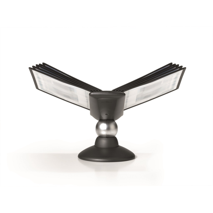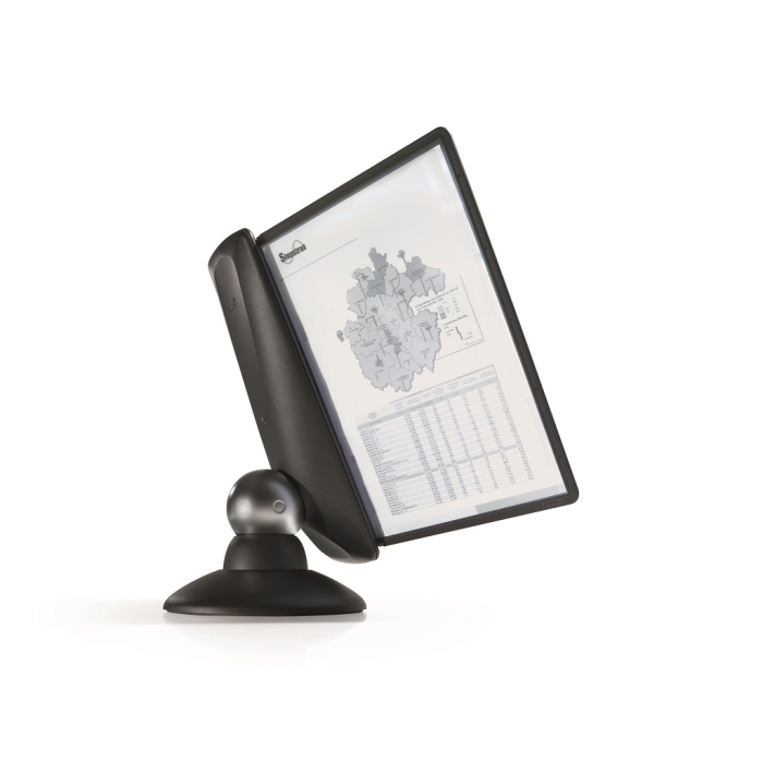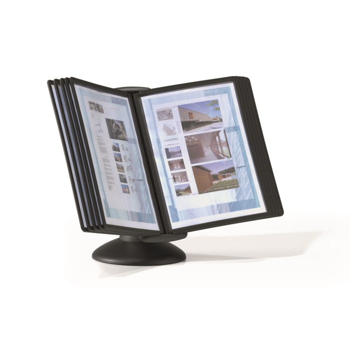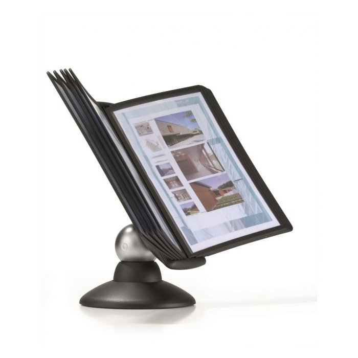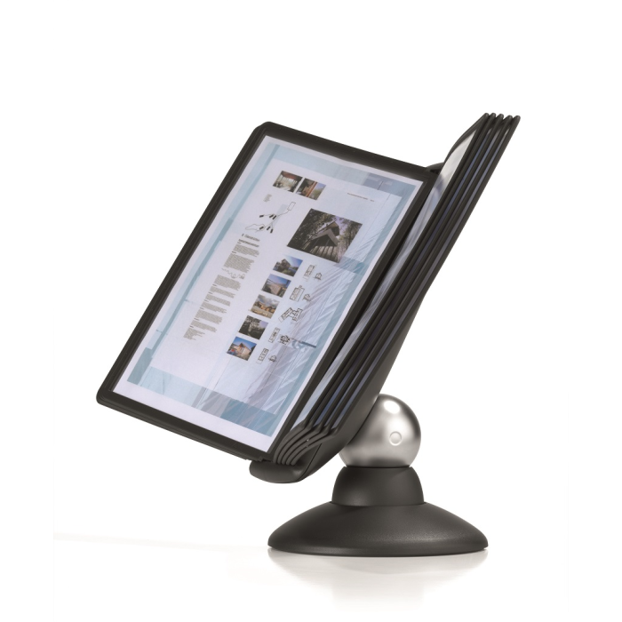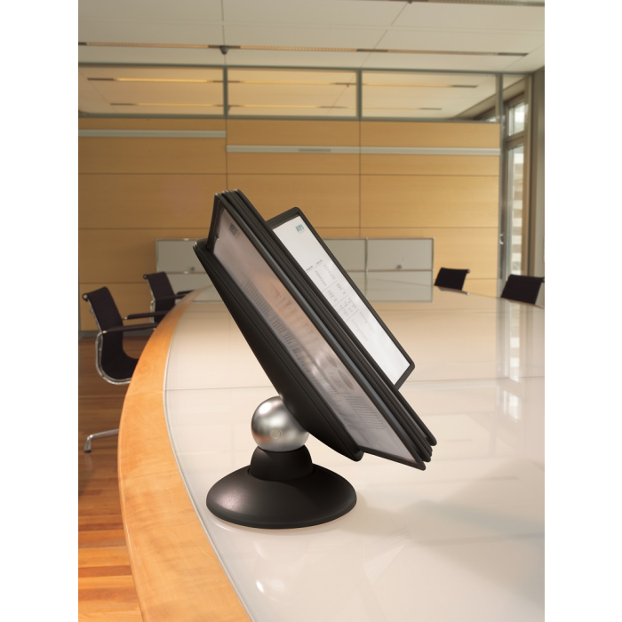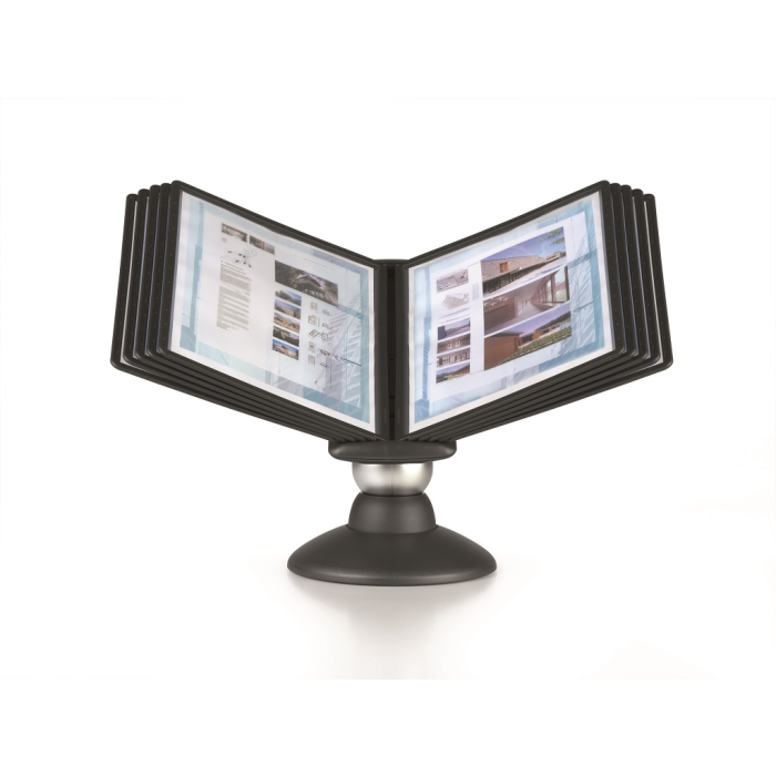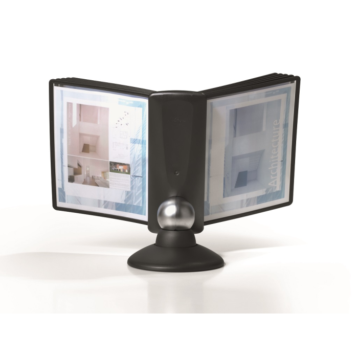 Unikátny dizajn spojený s kreatívnosťou a funkčnosťou stojana na stôl. Dodávaný s 10 panelmi. Guľový kĺb zabezpečuje bezproblémové otáčanie panelov o 360 °, uhol na čítanie nastaviteľný medzi 25 ° a 70 °. Farba čierna.