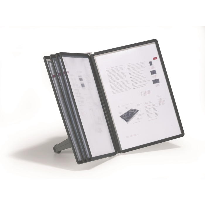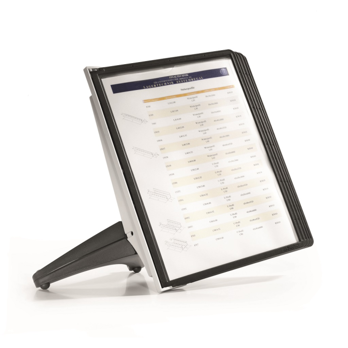 Stojan na stôl s 5 polypropylénovými displejovými panelmi formátu A4 do malých kancelárií. Stabilná základňa, systém ideálny pre užívateľov, ktorí sú obmedzení nedostatkom miesta. Farba základne i panelových rámčekov čierna. Kapacita panelov: 5 Dodávaný: s panelmi Farby panelov: čierna