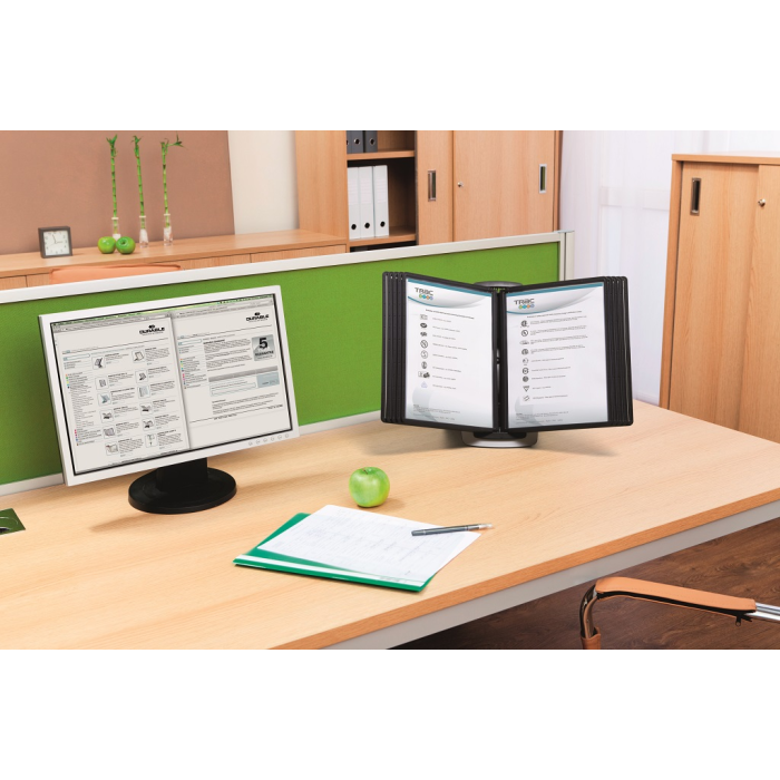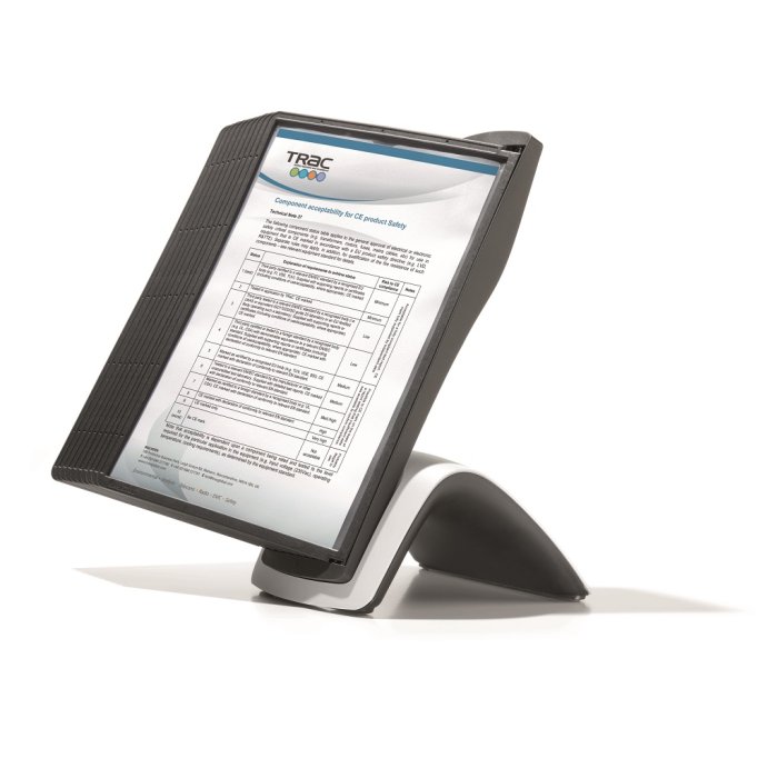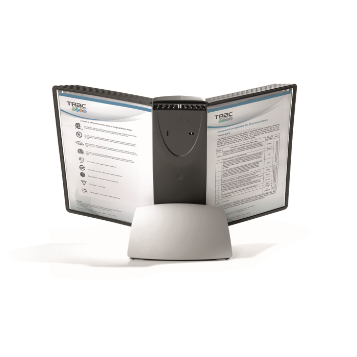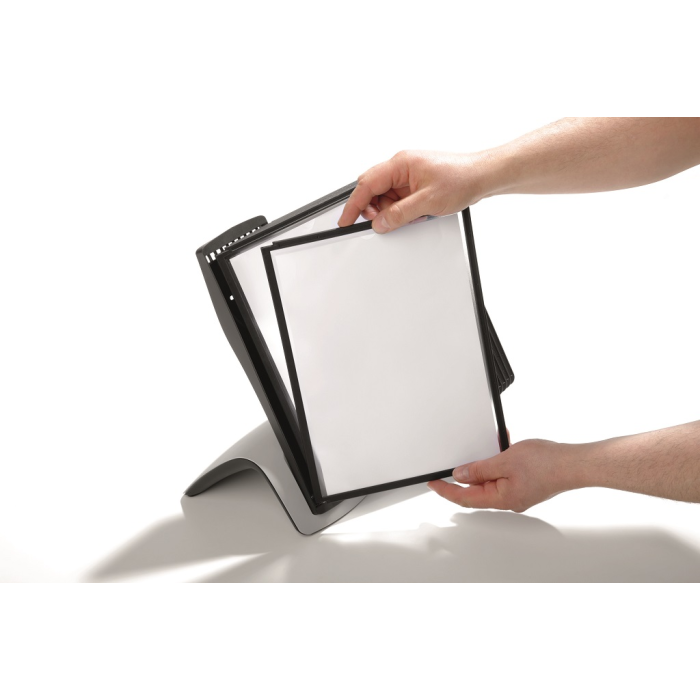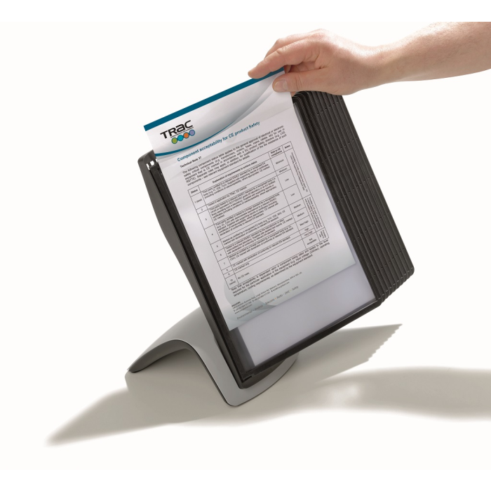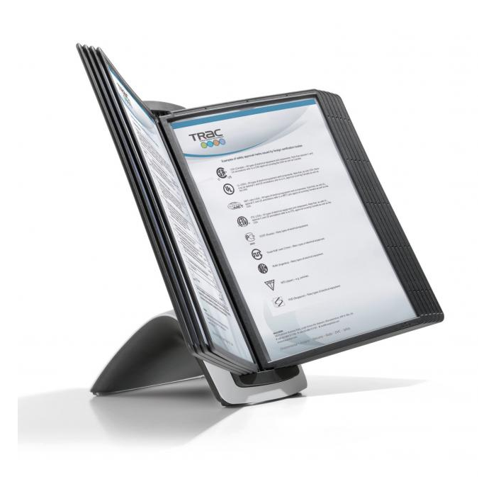 Štýlový stojan na stôl dodávaný s 10 displejovými panelmi SHERPA a indexami. Ideálny do kancelárií a na verejne prístupné miesta. Otvor na hornej strane panelu zabezpečuje jednoduché vkladanie a v prípade potreby rýchlu výmenu vložených materiálov. Farba panelov čierna.