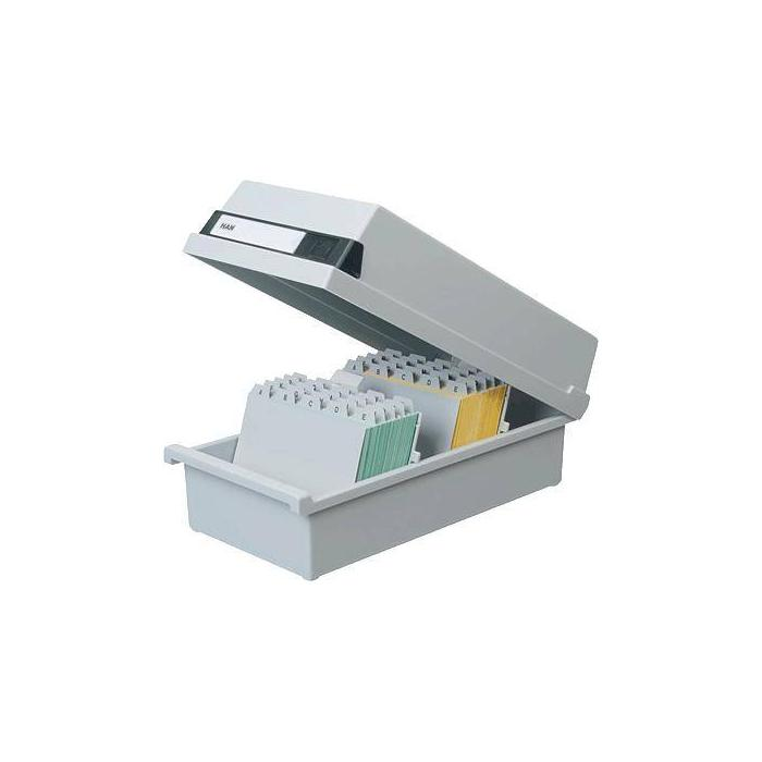 Kartotéka z antistatického nárazuvzdorného plastu na 1000 kartičiek ukladaných horizontálne. Vybavená dvoma plastovými oddeľovačmi, (inak prázdna) a ochrannými plstenými podložkami. Pri používaní možno odňať kryt a podložiť ho pod kartotéku.