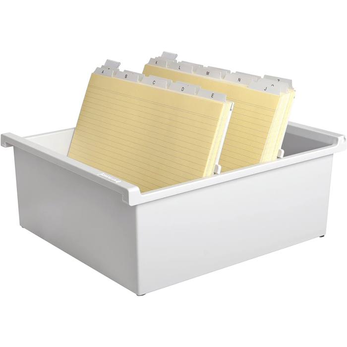 Kartotéka z antistatického nárazuvzdorného plastu na 1000 kartičiek ukladaných horizontálne. Vybavená dvoma plastovými oddeľovačmi, (inak prázdna) a ochrannými plstenými podložkami. Dodávaná bez vrchného krytu. br />Formát karty: A4