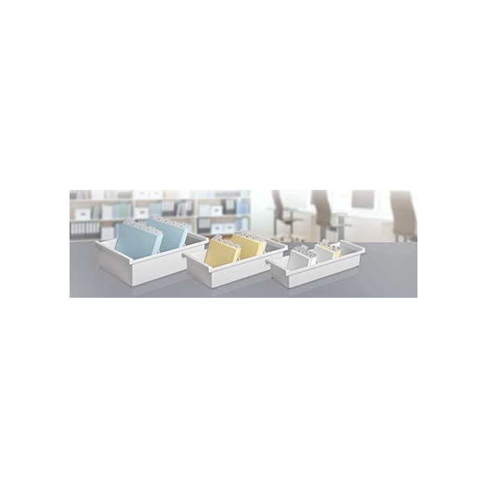 Kartotéka z antistatického nárazuvzdorného plastu na 1000 kartičiek ukladaných horizontálne. Vybavená dvoma plastovými oddeľovačmi, (inak prázdna) a ochrannými plstenými podložkami. Dodávaná bez vrchného krytu. br />Formát karty: A6