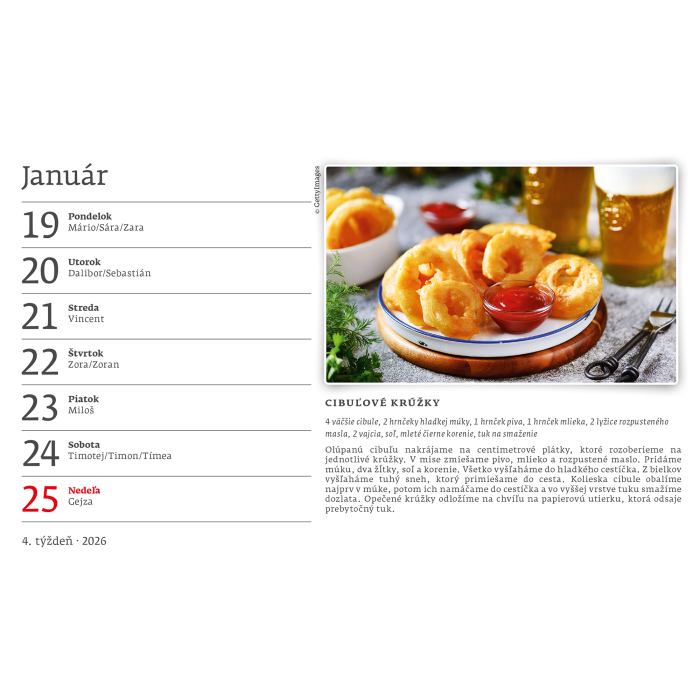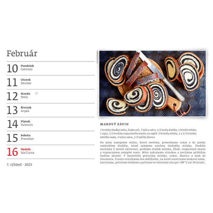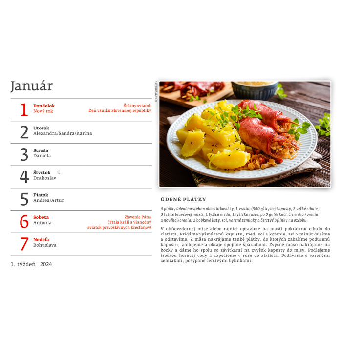 Formát kalendára: 22,6 x 13,9 cm Kalendárium: slovenské týždenné riadkové Počet strán kalendára: 58 + 2 Stojanček: s plným dnom Priestor na potlač: 22,6 x 3 cm