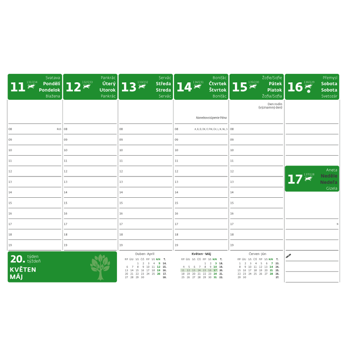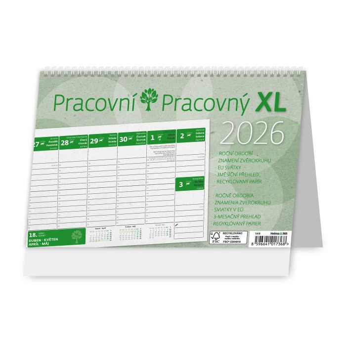 Formát kalendára: 24 x 16 cm Kalendárium: slovenské týždenné stĺpcové CZ/SK Počet strán kalendára: 64 + 2 Stojanček: so zámkom Priestor na potlač: 24 x 3 cm Vytlačené na recyklovanom papieri +ročné obdobia, znamenia zverokruhu, sviatky EÚ, 3 mesačný preľad