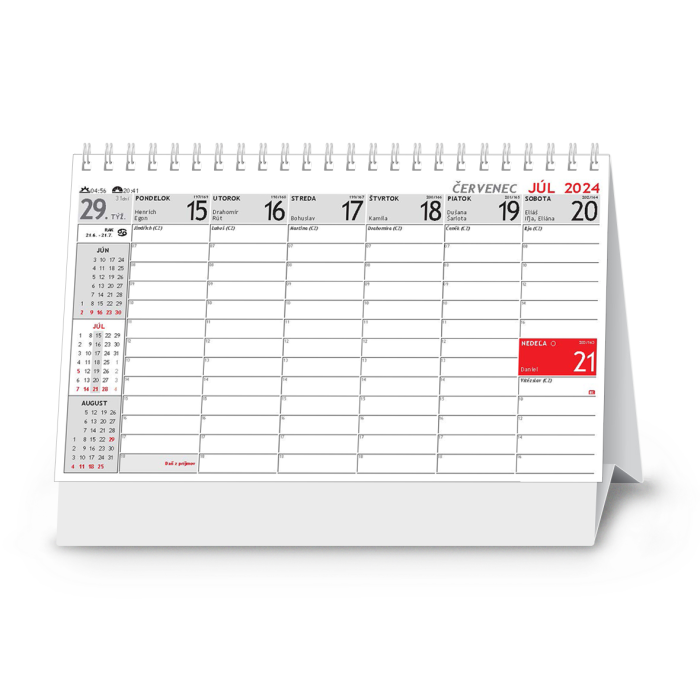Praktický stĺpcový kalendár s prehľadom najbližších mesiacov na ľavej strane. Dostatok miesta na plánovanie celého týždňa. Obsahuje dane, sviatky v EU, východy a západy slnka, fázy mesiaca.