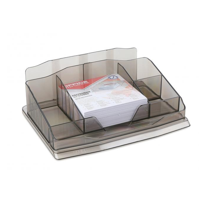 Priehľadný organizér na stôl na písacie potreby a drobné kancelárske potreby s poznámkovou kockou. Výška 14 cm. Farba dymová.