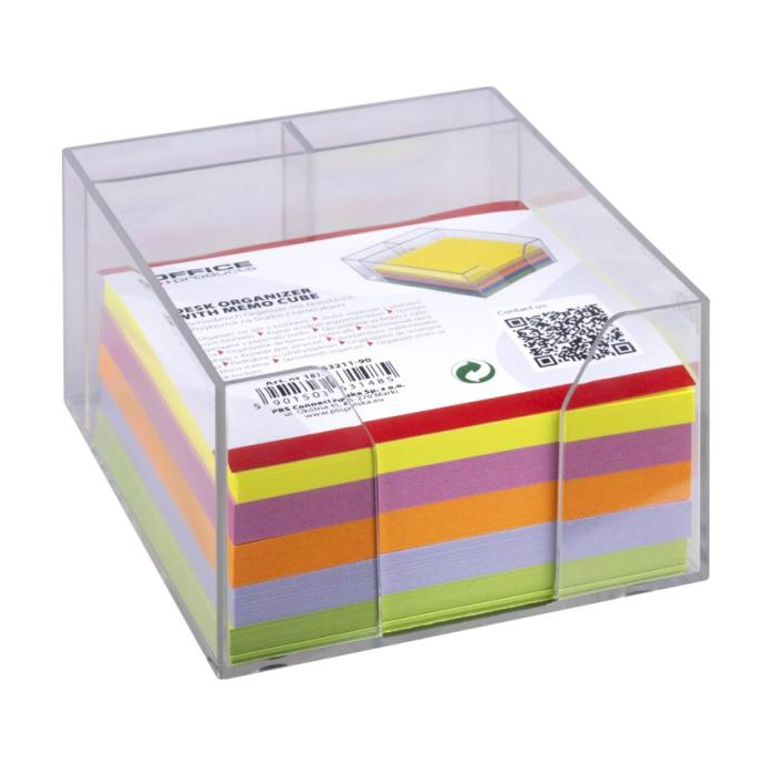 Organizér na stôl s farebnými lepiacimi papierikmi, odolný a odolný voči praskaniu. 3 priehradky, vrátane: 2 priehradiek na perá, 1 priehradky na lepiace papieriky (súčasťou balenia). Rozmery priehradky na papieriky: 85 x 85 mm. Rozmery papierikov: 82 x 82 mm. Rozmery nádoby: 108 x 90 x 55 mm. Farba: priehľadná.