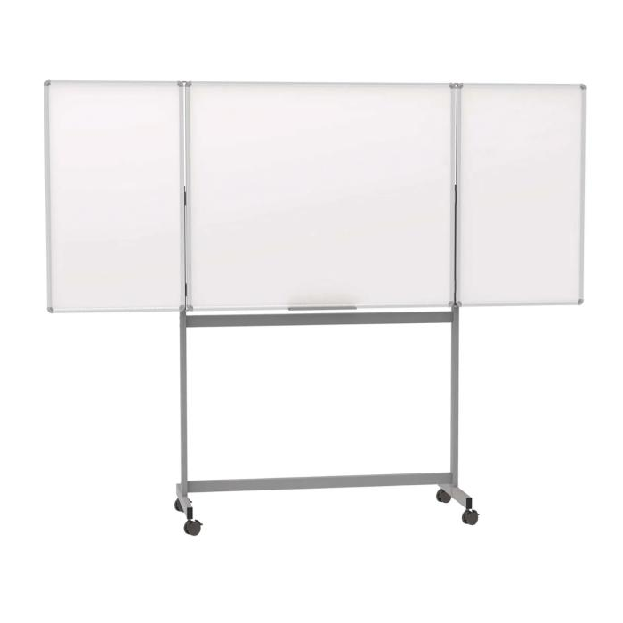 Veľká plocha na písanie na minimálnom priestore - 5 popisovateľných strán, dve vyklápateľné krídla. Povrch tabule z oceľového plechu s plastovou povrchovou úpravou, vhodný na časté používanie. Magneticky priľnavé, popisovateľné a stierateľné nasucho. Profil rámu tabule zo strieborného eloxovaného hliníka. Mobilná vďaka štyrom veľkým dvojitým otočným kolieskam s ľahkým chodom, s možnosťou zaistenia. Kovová odkladacia miska, ktorú možno vysunúť smerom nadol. Dvojitá pracovná plocha, biela tabuľa na oboch stranách.