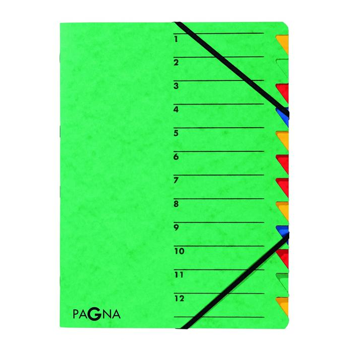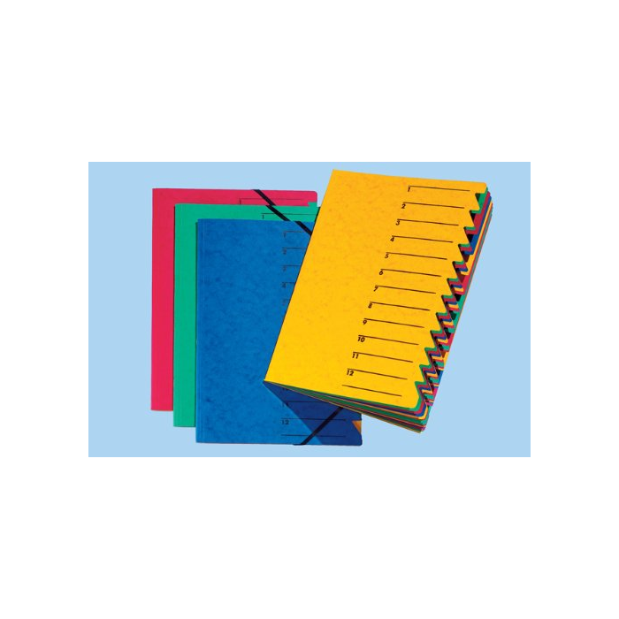 Triediaca zložka s 12 oddielmi, farebnými kartónovými listami a indexom, uzatvárateľná gumičkou. Možnosť popisu obsahu na titulnej strane. Farba vrchného obalu: zelená Počet oddielov: 12