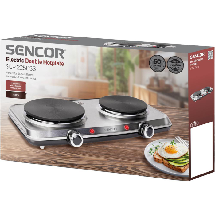 2 varné dosky s priemerom 18 a 15 cm Povrch z nehrdzavejúcej ocele Plynule regulovaný termostat Jednoduchá obsluha a čistenie Ochrana proti prehriatiu Ľahko prenosný Svetelný indikátor Protišmykové nožičky Vypínač ON/OFF Príkon: 2 250 W
