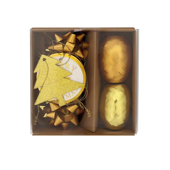 Vianočná súprava na balenie darčekov. Obsahuje: stužky 5mmx10m - 2 kusy, mašle - 6 ks, štítky na darčeky - 6 ks.