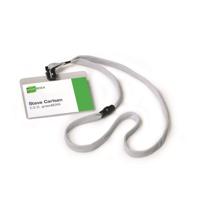 Visačka na krk s farebným bezpečnostným remienkom dĺžky 44 cm. Poistka na remienku sa uvoľní pri zachytení remienka alebo silnom potiahnutí. Materiál pevné priehľadné PVC, závesný remienok šírky 10 mm. Balenie 10 ks. Náhradné papieriky DU145602. Rozmery visačky: 90×60 mm Farba remienka: sivá