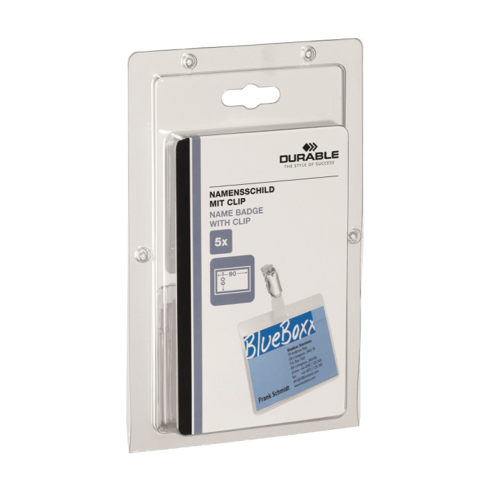 Priehľadná visačka s európskym štipcom, umiestneným na dlhšej strane visačky. Dodávané s papierovými kartičkami rozmerov 90 × 60 mm. Model, pri ktorom možno menovku vyberať bez potreby odnímania štipca s remienkom. Farba transparentná. Balenie 5 ks.