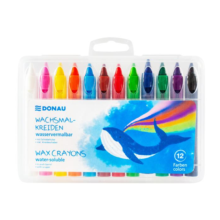 12 farebných voskových pasteliek v praktickej posuvnej tube, rozpustných vo vode a miešateľných pre rôzne techniky kreslenia. Každá pastelka sa dá ľahko vykrútiť a individuálne tvarovať pomocou priloženej škrabky. Balené v priehľadnom PP puzdre s eurozásuvkou na zavesenie - ideálne do školy, na hobby a na cesty.