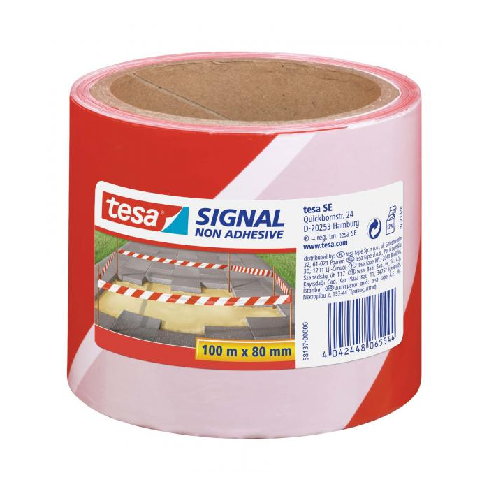 Nelepivá páska s obojstrannou potlačou na vyznačovanie dočasných prekážok. Odolná voči UV žiareniu 3 mesiace. Rozmery 80 mm × 100 m. Farba červeno-biela.