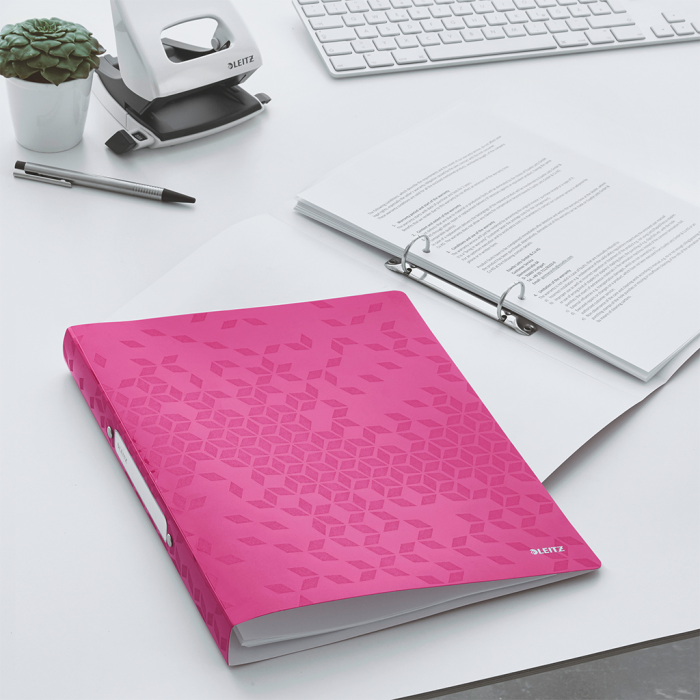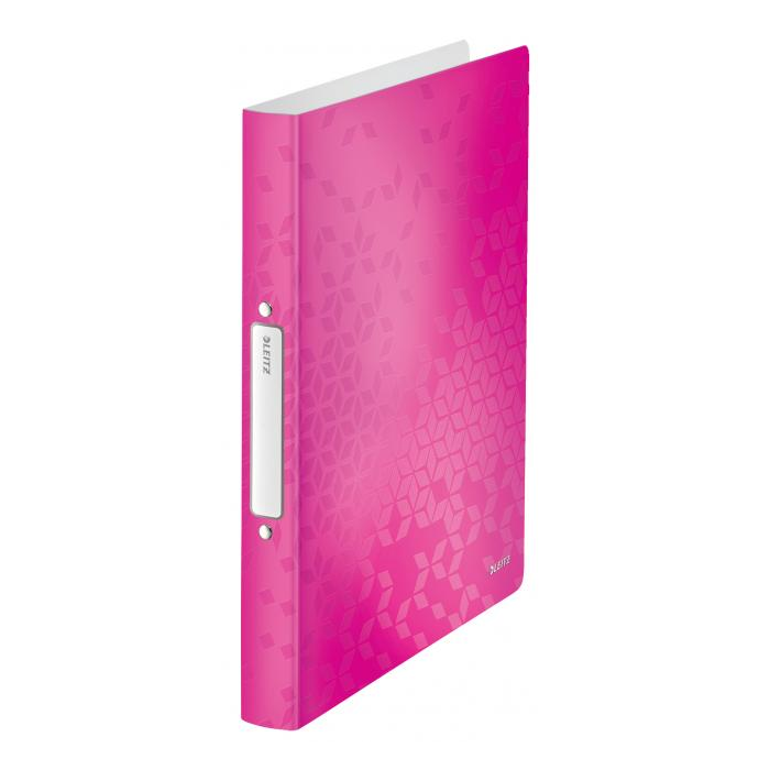 2-krúžkový zakladač v žiarivých farbách WOW s dvojfarebným efektom na prezentácie či archiváciu dokumentov. Vyrobený z dvojvrstvového polypropylénu (PP). Vhodný pre zakladanie perforovaných dokumentov alebo vložených v závesných obaloch. Samolepiaci chrbtový štítok na popis obsahu. Šírka chrbta 25 mm, 2 krúžky. Kapacita: 190 listov A4 (80 g/m²). Farba ružová.