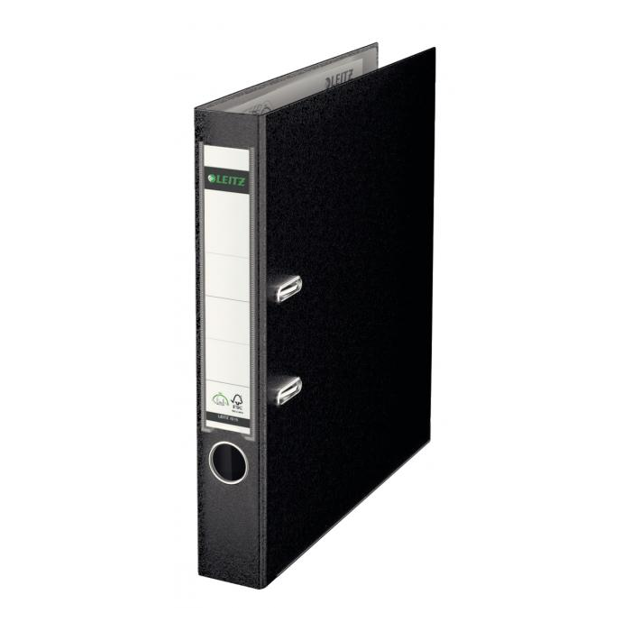 Patentovaný pákový celoplastový zakladač formátu A4 vyrobený z kvalitného kartónu. Vonkajšia strana potiahnutá farebnou polypropylénovou fóliou, vnútorná svetlosivou fóliou. Zakladač je vybavený vysokokvalitnou mechanikou Leitz, chrbtovým krúžkom, kovovou lištou a vymeniteľným papierovým štítkom na popis. Vysokokvalitná mechanika umožňuje o 50 % širšie otvorenie zakladača než dovoľuje bežná páková mechanika, čo znamená až 20 % úspory času pri manipulácii a archivácii dokumentov. Šírka chrbta 5,2 cm. Väčšie balenie 10 ks. Farba čierna.