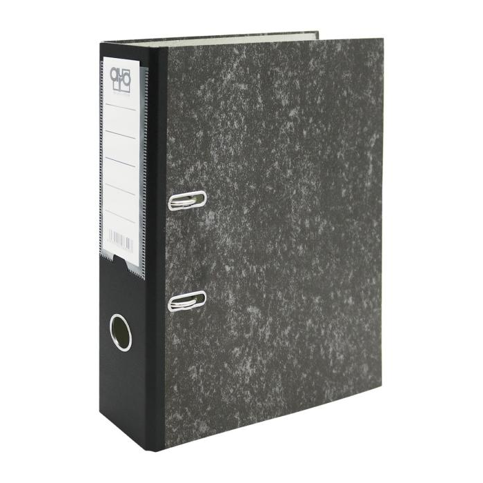Kartónový pákový zakladač - poťah čierny mramor. Chrbtový otvor pre lepšiu manipuláciu, chrbát 7,5 cm polepený čiernou plastovou fóliou na spevnenie, plastové chrbtové vrecko na výmenu štítku. Rado mechanika.