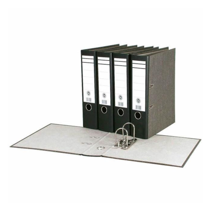 Zakladač so štruktúrovaným papierovým poťahom mramorového vzoru, formát A4. Vybavený rado zámkom, kovovým prítlakom, chrbtovým krúžkom a nalepeným chrbtovým štítkom. Šírka chrbta 7,5 cm. Väčšie balenie: 20 ks. Farba čierna.