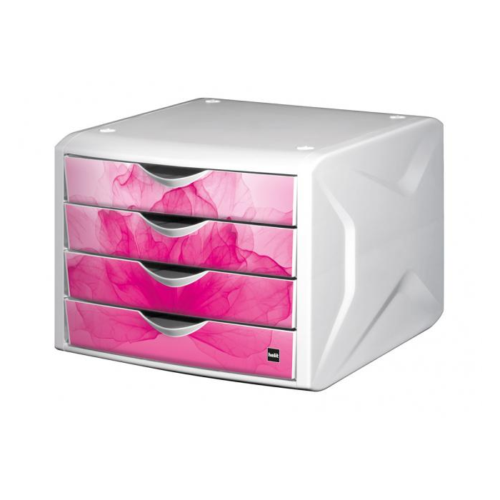 Stohovateľný box z odolného polypropylénu so štyrmi zatvorenými zásuvkami a dekoráciou na prednej strane zásuviek. Svieži dizajn. Rozmery (š × v × h) 262 × 212 × 330 mm.