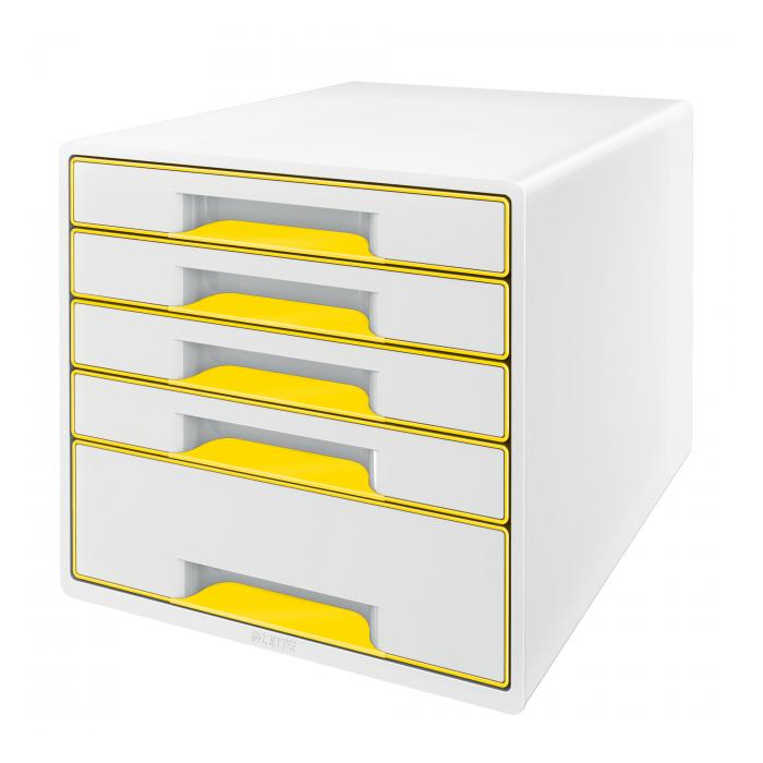 Box, dopĺňajúci produktovú radu Leitz WOW. Ľahko vysúvateľné 4 malé a 1 veľká zásuvka so zarážkou proti úplnému vysunutiu, jednoduché otváranie a zatváranie. Gumové nožičky pre lepšiu stabilitu, rozlišovač na popis zásuvky. Rozmery 287 × 270 × 363 mm. Farba žltá.