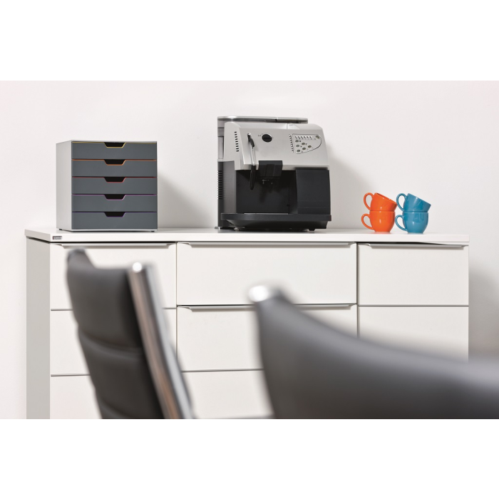 Boxy s 5 zásuvkami s vnútrami dúhových farieb dodajú kancelárii nádych elegancie. Pri ich zatvorení farebné línie iba jemne vystupujú z elegantnej sivej farby, pri otvorení sú žiarivé farby dúhy potešením pre oči. Dodávané s priehľadnými plastovými indexami na označenie obsahu. Boxy sú stohovateľné, zásuvky zabezpečené proti vypadnutiu. Materiál najkvalitnejší ABS plast, tichý a ľahký posun zásuviek, spodná strana s protišmykovou ochranou. Víťaz Product design award 2013. Rozmery (š × v × h) 292 × 280 × 356 mm.