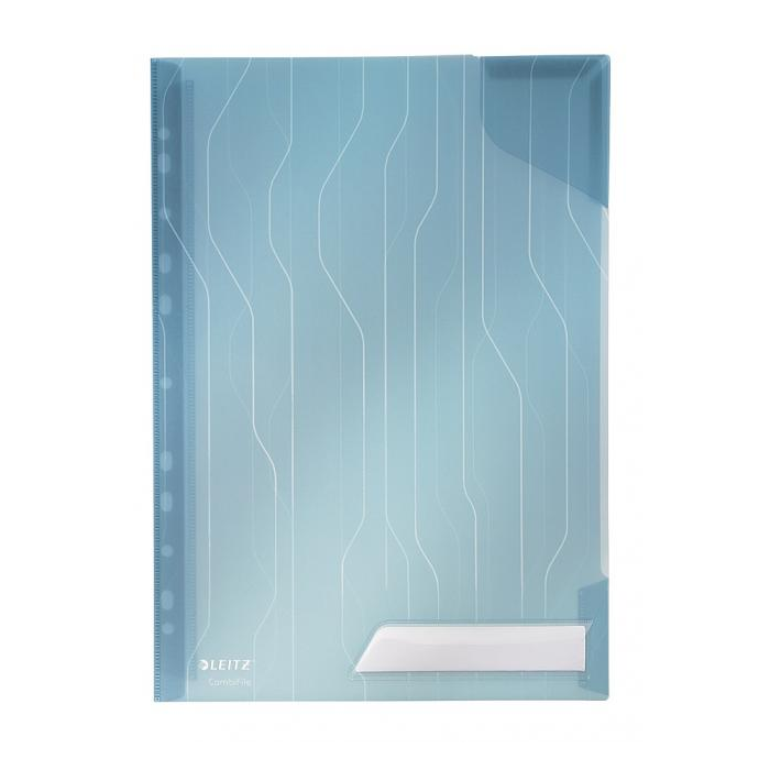Unikátny závesný obal typu `L`, ktorý kombinuje vlastnosti euroobalov a obalov vďaka patentovanej skrývateľnej multiperforácii do špeciálneho puzdra. Obsahuje rohovú chlopňu, ktorá chráni vložený dokument a vrecko na popis obsahu s vymeniteľným štítkom. Vyrobený z kvalitného priehľadného PP s embosovaným vzorom. Hrúbka 200 um. Kapacita 40 listov papiera formátu A4. Balenie 5 ks. Farba: modrá