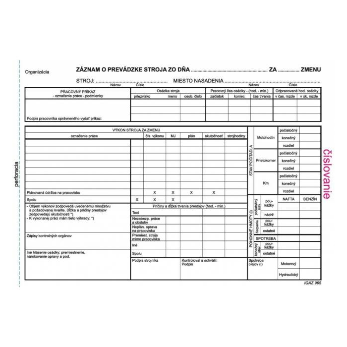 Tlačivo : Záznam o prevádzke stroja A5, 100 listov, samoprepis - originál + 1 kópia, číslovaný.
