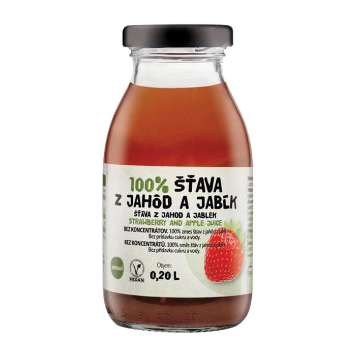 100 % zmes štiav bez alergénov a bez prídavku cukru a vody. Obsahuje iba prírodné cukry. Príchuť jahodovo-jablková. Objem 0,2 l. Balenie 10 x 0,2 l.