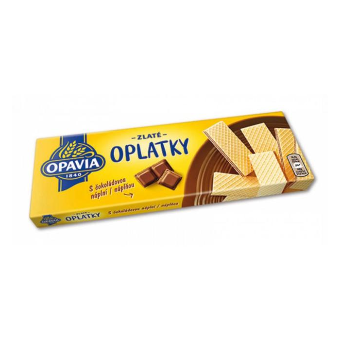 Jemné oblátky OPAVIA s čokoládovou príchuťou. Hmotnosť 146 g.