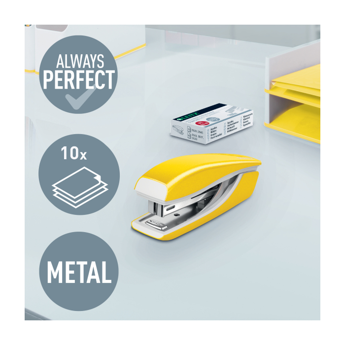 Malá zošívačka v moderných žiarivých farbách ideálna nielen do kancelárie, ale aj domov alebo na cesty. Vždy perfektné zošitie vďaka patentovanej technológii DIT. V kombinácii so spinkamii Leitz Power Performance P2 (č. 10) dosiahnete vždy jednoduché a správne zošitie.Kapacita 10 hárkov. Vrecková zošívačka. Patentovaná technológia DIT na spoľahlivé zošívanie. Balenie v škatuľke, vrátane spiniek. Otvorením ramena o 180° je možné použiť nástenkové zošívanie (takrovanie). Farba žltá.