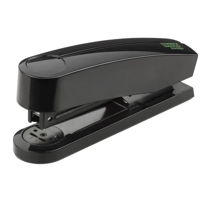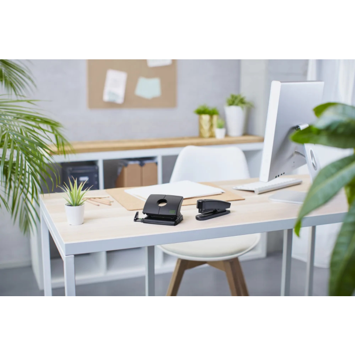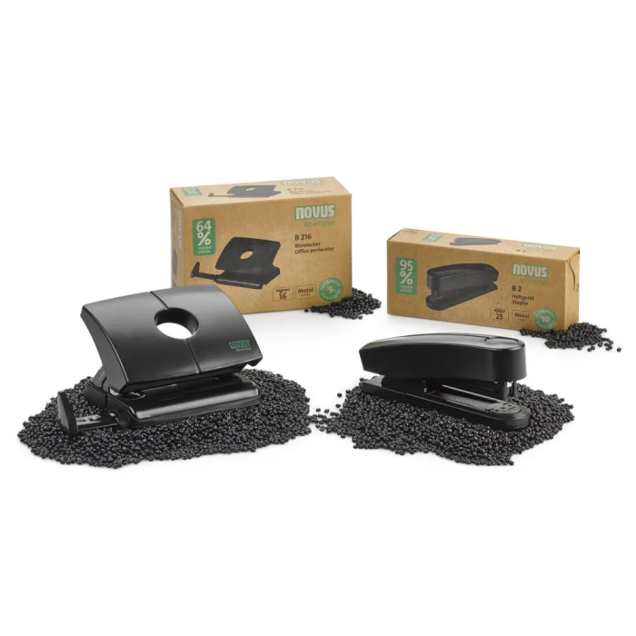 Zošívačka pre použitie doma alebo v domácich kanceláriách z kolekcie šetrnej k životnému prostrediu re+new, s vrchnou časťou vyrobenou z 95% recyklovaného plastu. Kovový zásobník, jednoduché vedenie spiniek, kapacita náplne 100 spiniek 24 / 6 alebo 150 spiniek 26 / 6. Hĺbka zošívania 6,5 cm. Hmotnosť 175 g. Záruka 10 rokov. Súčasťou balenia je 200 spiniek 24 / 6 DIN SUPER. Kapacita 25 listov. Farba čierna.