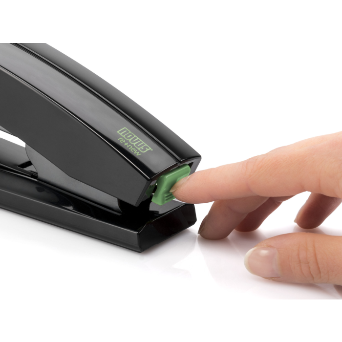 Celokovová kancelárska zošívačka pre každodenné profesionálne použitie z kolekcie šetrnej k životnému prostrediu re+new, s lesklým plášťom z 81% recyklovaného plastu. Dvojité vedenie spiniek, kapacita náplne 100 spiniek 24 / 6 - 8 alebo 150 spiniek 26 / 6 - 8. Hĺbka zošívania 6,5 cm. Hmotnosť 245 g. Záruka 25 rokov. Súčasťou balenia je 200 spiniek 24 / 6 DIN SUPER. Kapacita 40 listov. Farba čierna.