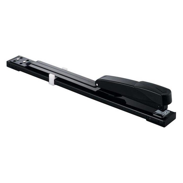 Zošívačka s dlhým ramenom na zošitie maximálne 20 listov. Hĺbka zošívania 30 cm. Spinky 24/ 6, 26/ 6. Farba čierna.