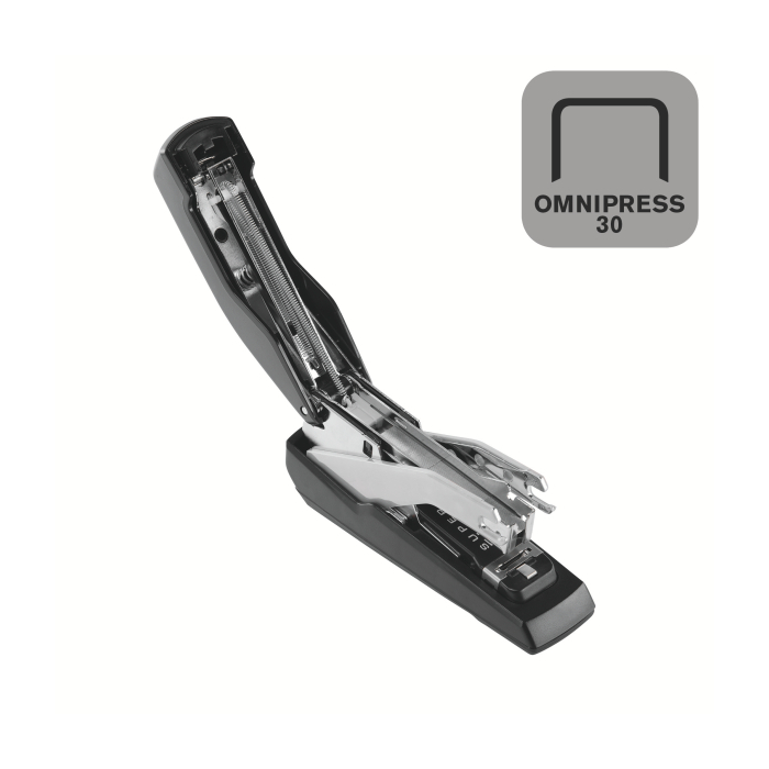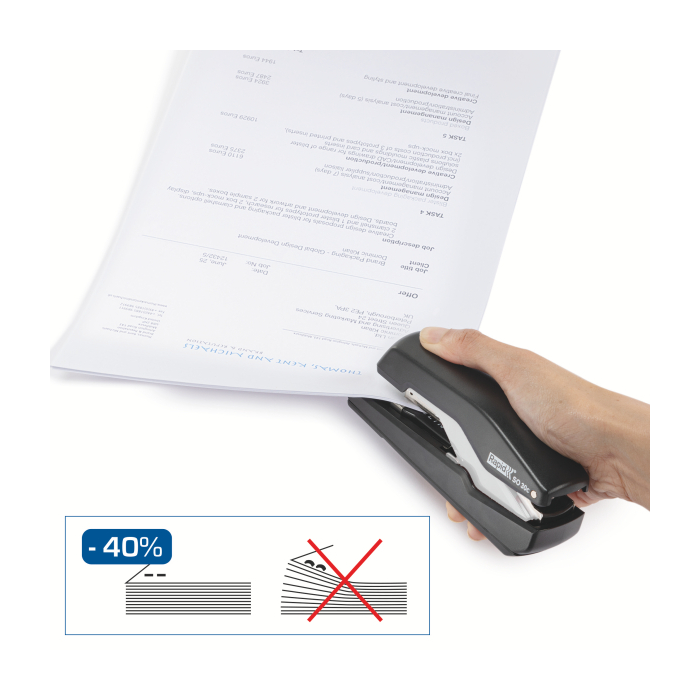 Revolučná kompaktná zošívačka, vybavená patentovanou technológiou Omnipress®, možno stlačiť kdekoľvek, aby ste ušetrili všetku námahu pri zošívaní, či už sa používa na stole alebo v ruke. Jedinečná technológia Super Flat Clinch znižuje stoh papiera o 40 %.